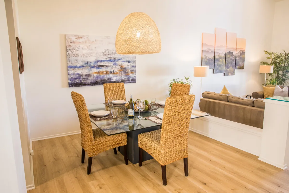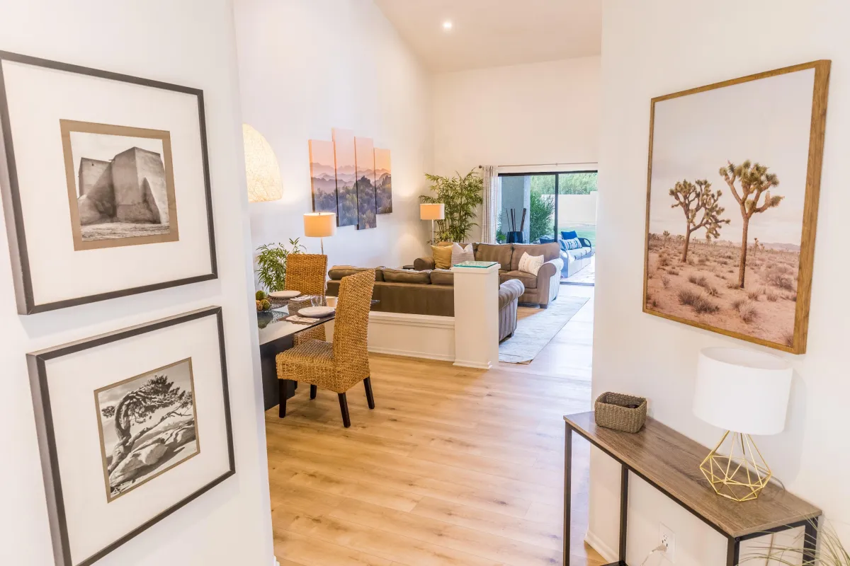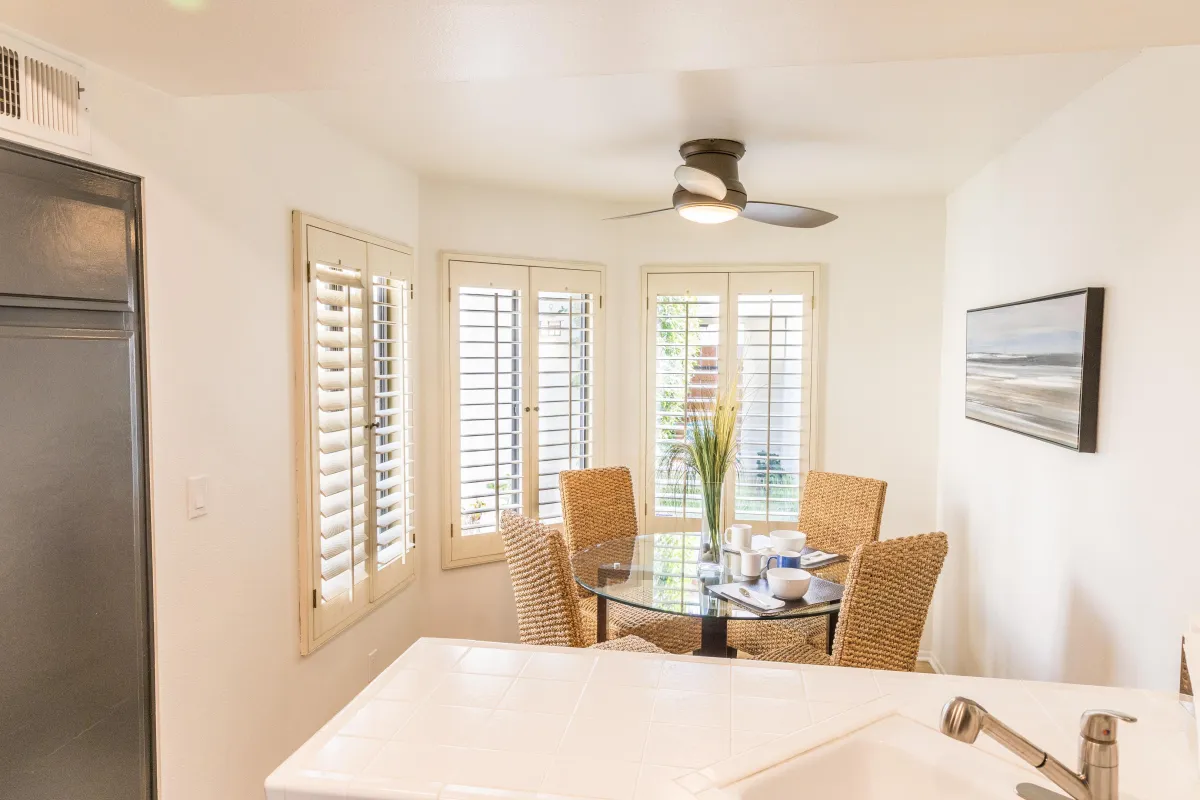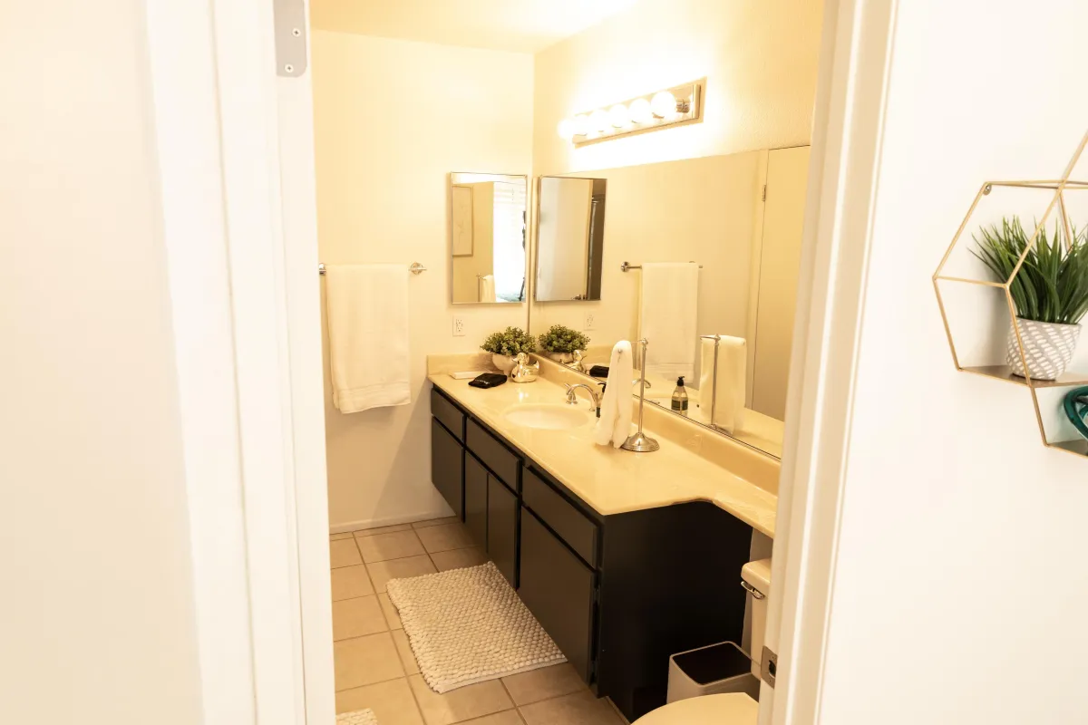 Desert Sky offers ground level entry with keypad check-in into the two-bedroom home. You'll walk into a spacious living area and dining room. The kitchen offers full sized appliances, dishes, cookware, Keurig, and a breakfast nook. The first bedroom offers a queen bed, SmartTV, and closet space. Our second bedroom has a king bed, SmartTV, and closet space. Both bedrooms have ensuite bathrooms and feature Puracy bath products.