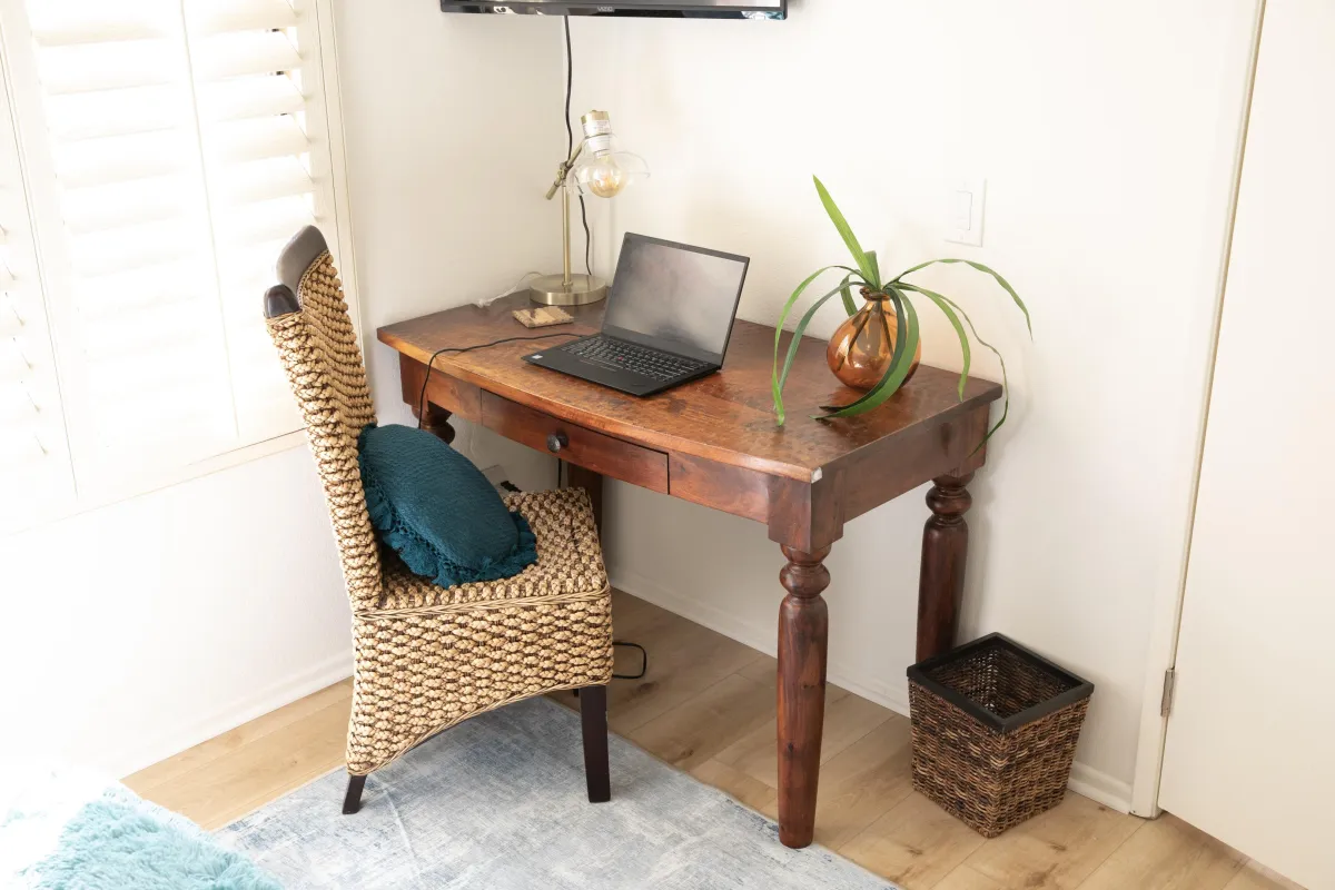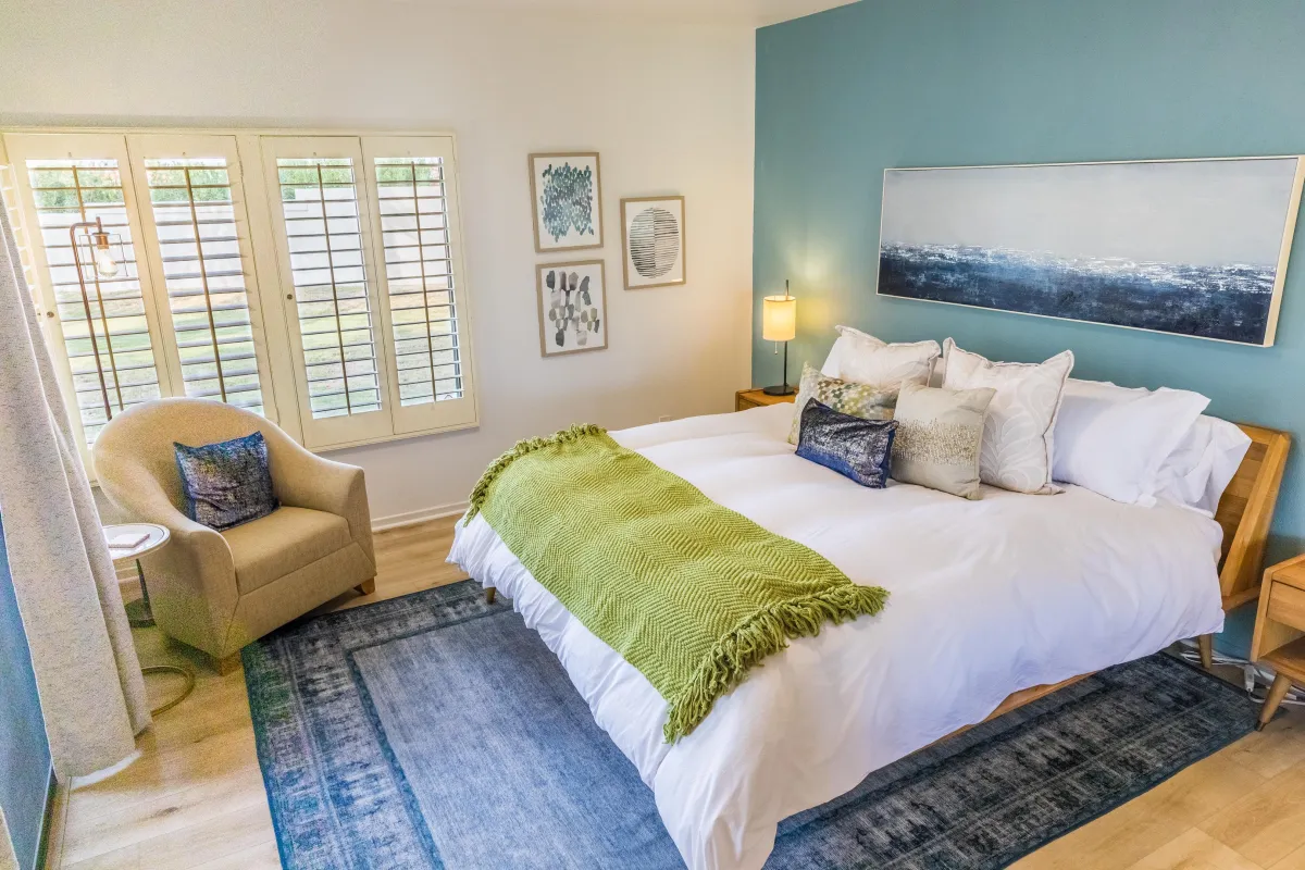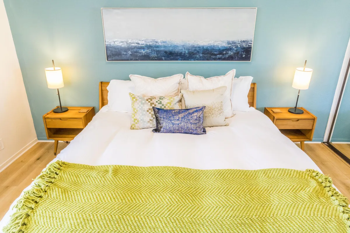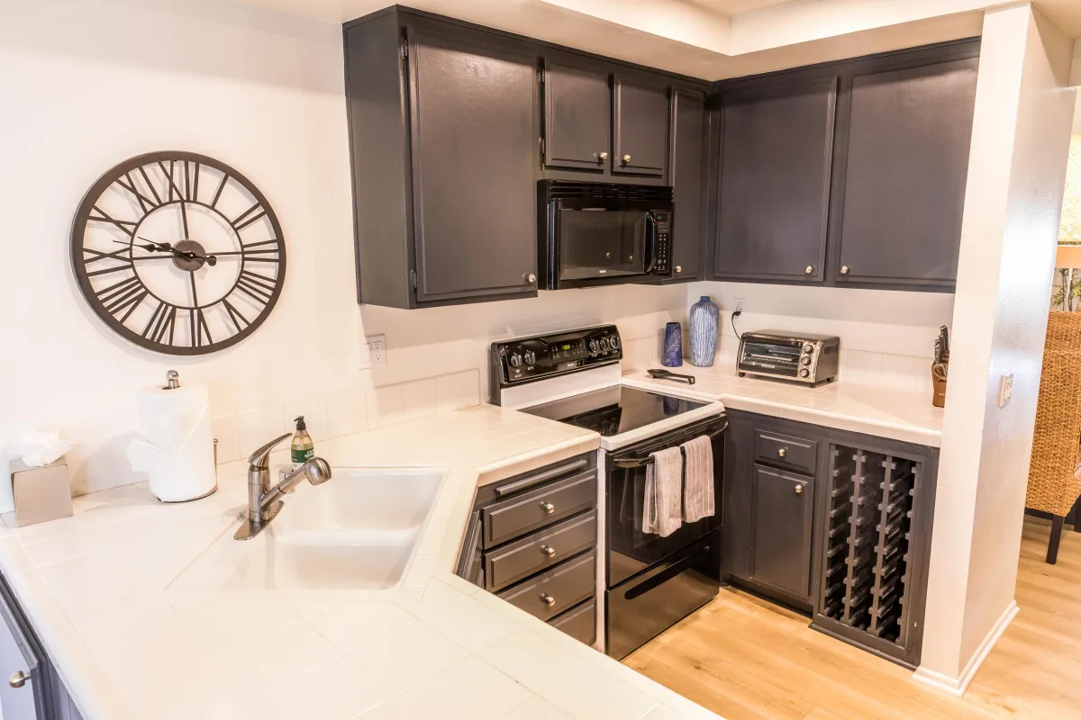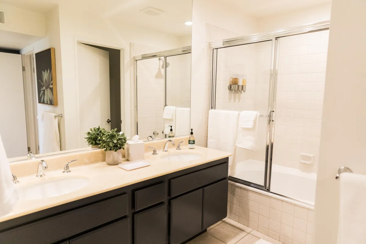 Desert Sky offers ground level entry with keypad check-in into the two-bedroom home. You'll walk into a spacious living area and dining room. The kitchen offers full sized appliances, dishes, cookware, Keurig, and a breakfast nook. The first bedroom offers a queen bed, SmartTV, and closet space. Our second bedroom has a king bed, SmartTV, and closet space. Both bedrooms have ensuite bathrooms and feature Puracy bath products.